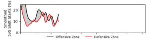 You can see Robertson’s initial defensive struggles were quickly brought under control after five games or so, only for his offensive game to similarly crater in the graph below, from HockeyViz: