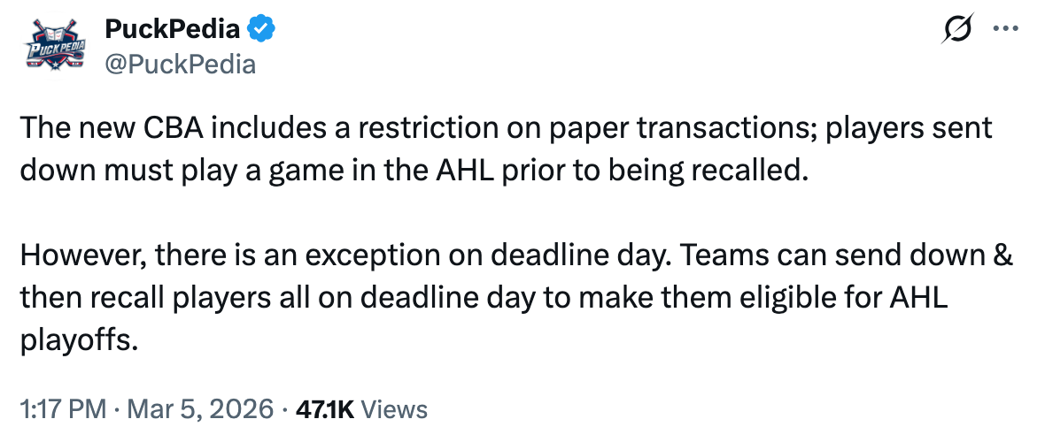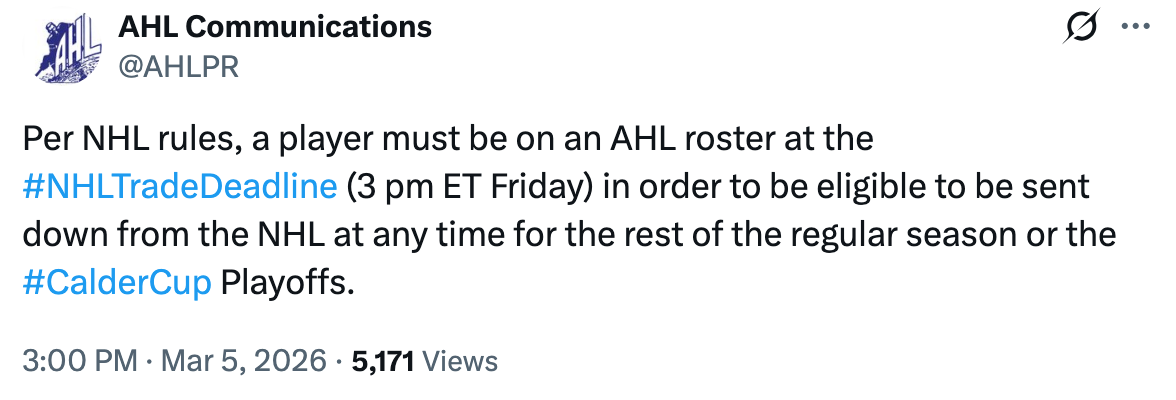 I’d still expect Hyry to be sent down tomorrow in one way or another, as the Stars will surely want to make him eligible for the AHL playoffs. (As a reminder, trade deadline day is the one day of the year where players can be “papered” down to the AHL and recalled without having to play a game.)