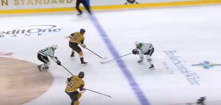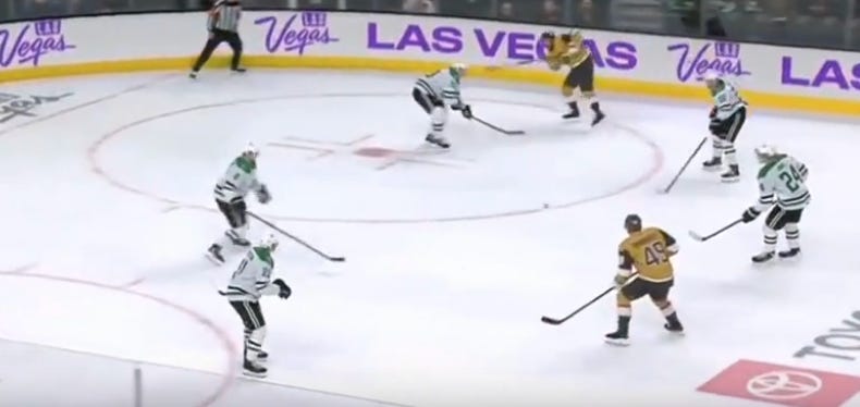 As you can see from the video, Jason Robertson very much wants to draw a Vegas player to him, then feed Heiskanen up top (who will then have the option of a shot with traffic or a feed to Rantanen (96 in white) on the other side.