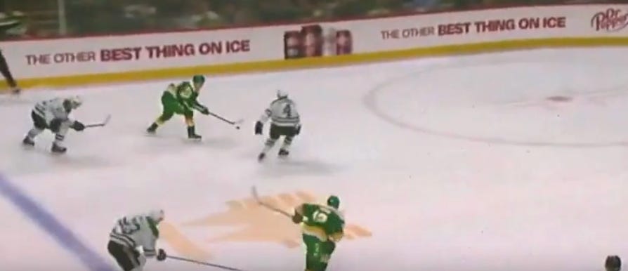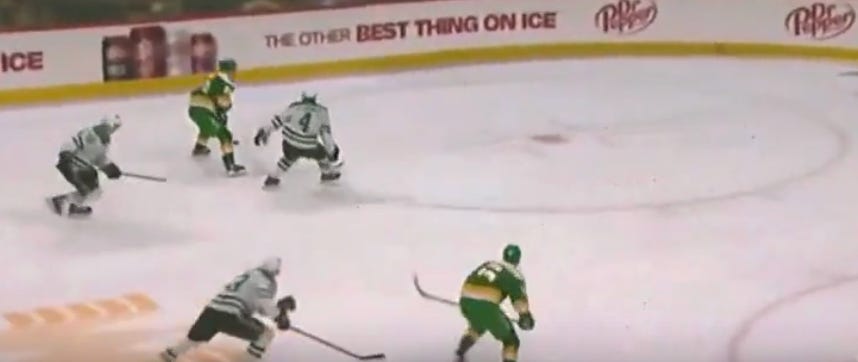 So on this rush in the third, with Dallas still up 4-1, Miro Heiskanen has to make a tough choice in a tough spot, and he makes a pretty poor one, all things considered: