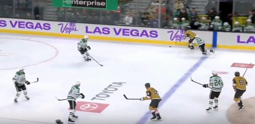 There’s a better play there, with multiple Vegas players clogging the shooting lane before the puck has a chance to get to Hintz at the netfront. And Stone’s block leads to a rush against that Stone (61 in gold) and Eichel (9) managed to squander. But don’t miss Heiskanen’s smart stick sweep here after Stone’s pass across, which I think prevents Eichel’s sending it right back to Stone.