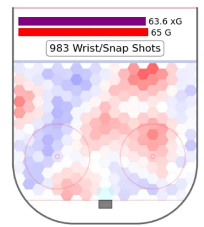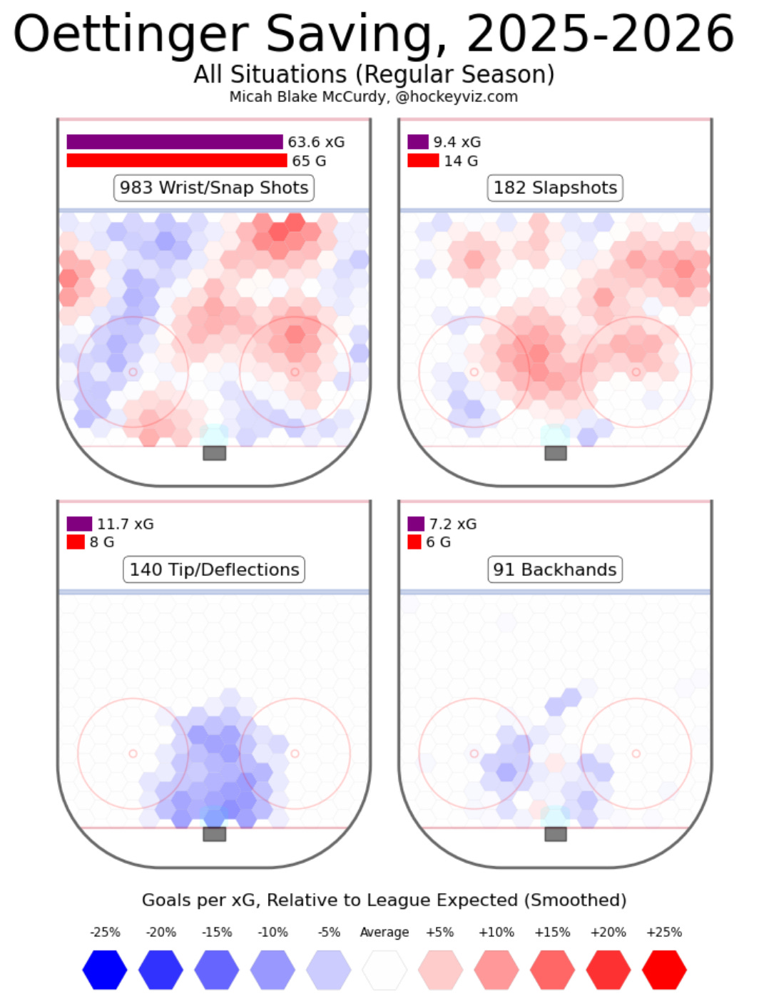 I’ll be frank here: I don’t know enough about all the mechanics of modern goaltending to say whether this is just a misread of the shot, an inherent limitation of blocker save attempts by any goaltender, or an actual flaw in Oettinger’s approach here. But I do know that Oettinger has been allowing more blocker-side (right side, for him) goals than league-average this year: