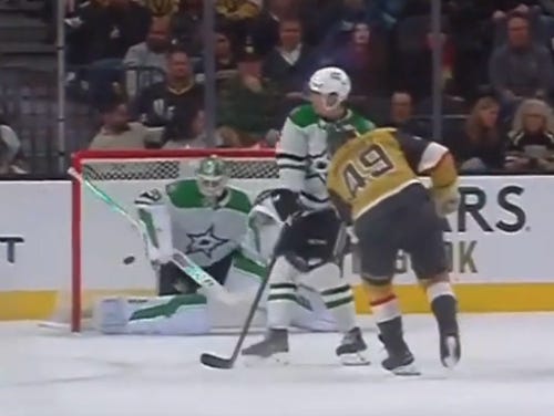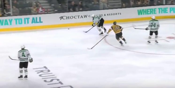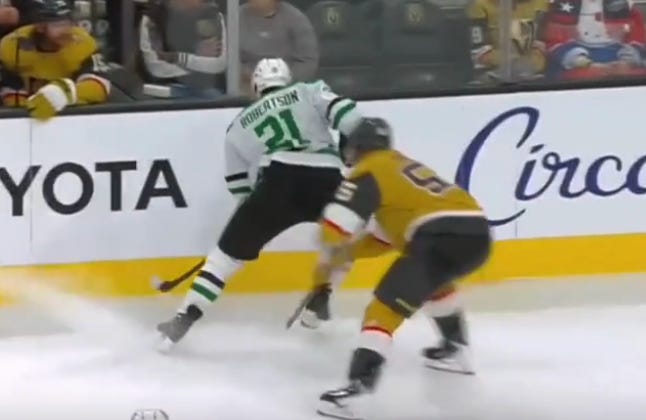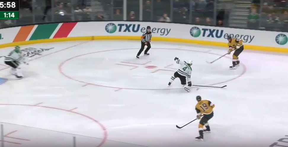 You can’t go back to Heiskanen there with Kolesar’s stick positioning, and Robertson doesn’t want to just fling it down the boards and risk an easy Vegas clearance. So instead, he takes a chance at beating his man, and the Stars paid dearly for it.