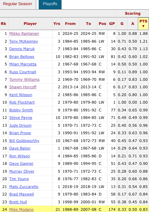 You can see Hull and Modano down there , and obviously Modano’s totals are the most impressive, given the low-scoring environment in which he played (both league and system) for most of those 174 playoff games.