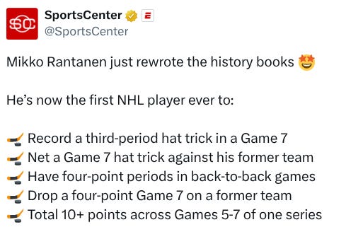 Wait, think about that. Wayne Gretzky never did that. Lemieux never did that, nor McDavid, Crosby, MacKinnon, or anyone in the 1980s, when goals were stocked in vending machines for ten cents apiece. Rantanen just did that, and he did it most recently against the best goaltender around (playoff performance notwithstanding).
