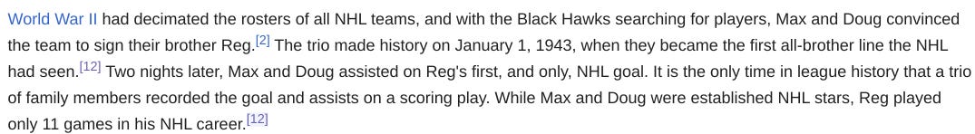 I met Jari Kurri this year, by the way. He’s a delight. That’s not one of the records Rantanen broke, but I’m including it here because it was fun for me, personally. I have not met Doug Bentley. But here’s a Doug Bentley stat for you, from his Wikipedia page:
