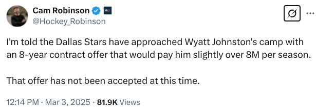 Roope Hintz and Miro Heiskanen both signed long-term extensions at $8.45 million per year. You can see a world where the Stars offer $8.1 million as Robinson alludes to, then Johnston’s camp asks for $9 million, after which they eventually settle at something like that same $8.45 million.