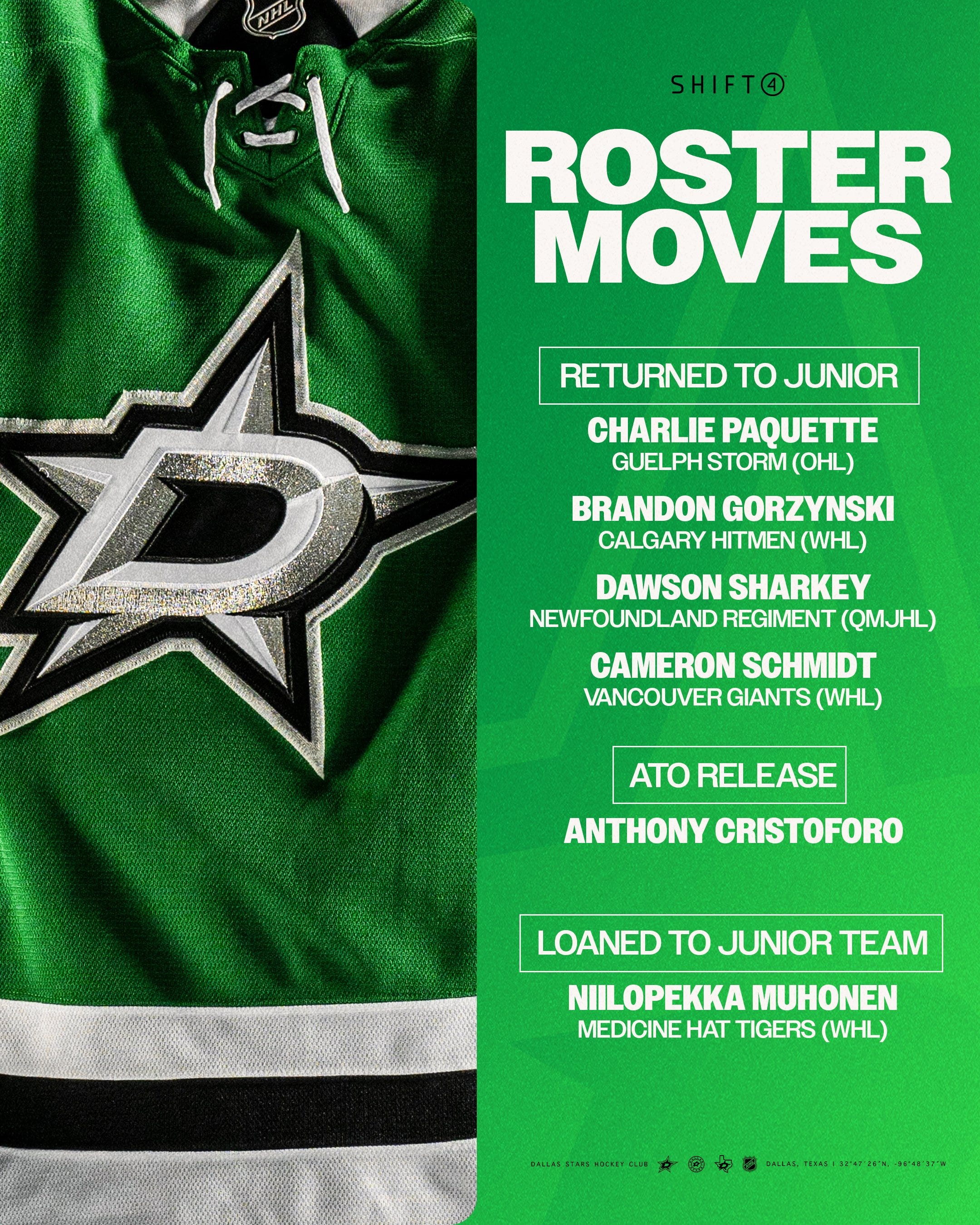 Four of the six roster moves were 2025 draft picks being returned to their junior teams (Charlie Paquette, Brandon Gorzynski, Dawson Sharkey, and Cameron Schmidt), with Niilopekka Muhonen having been drafted the year prior, in 2024.