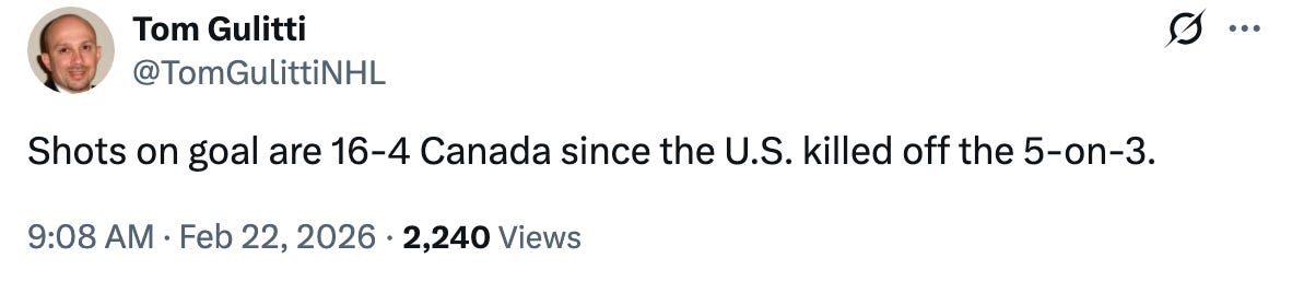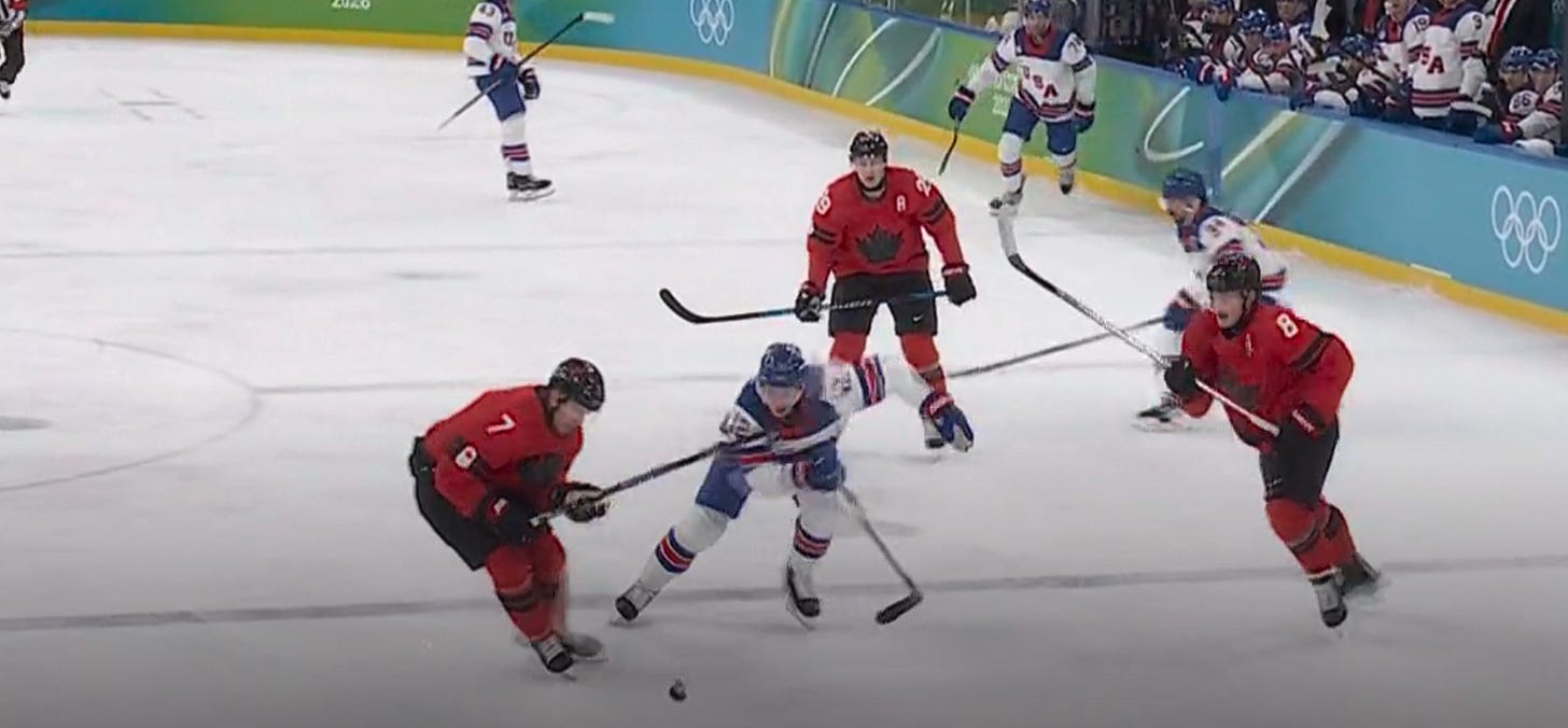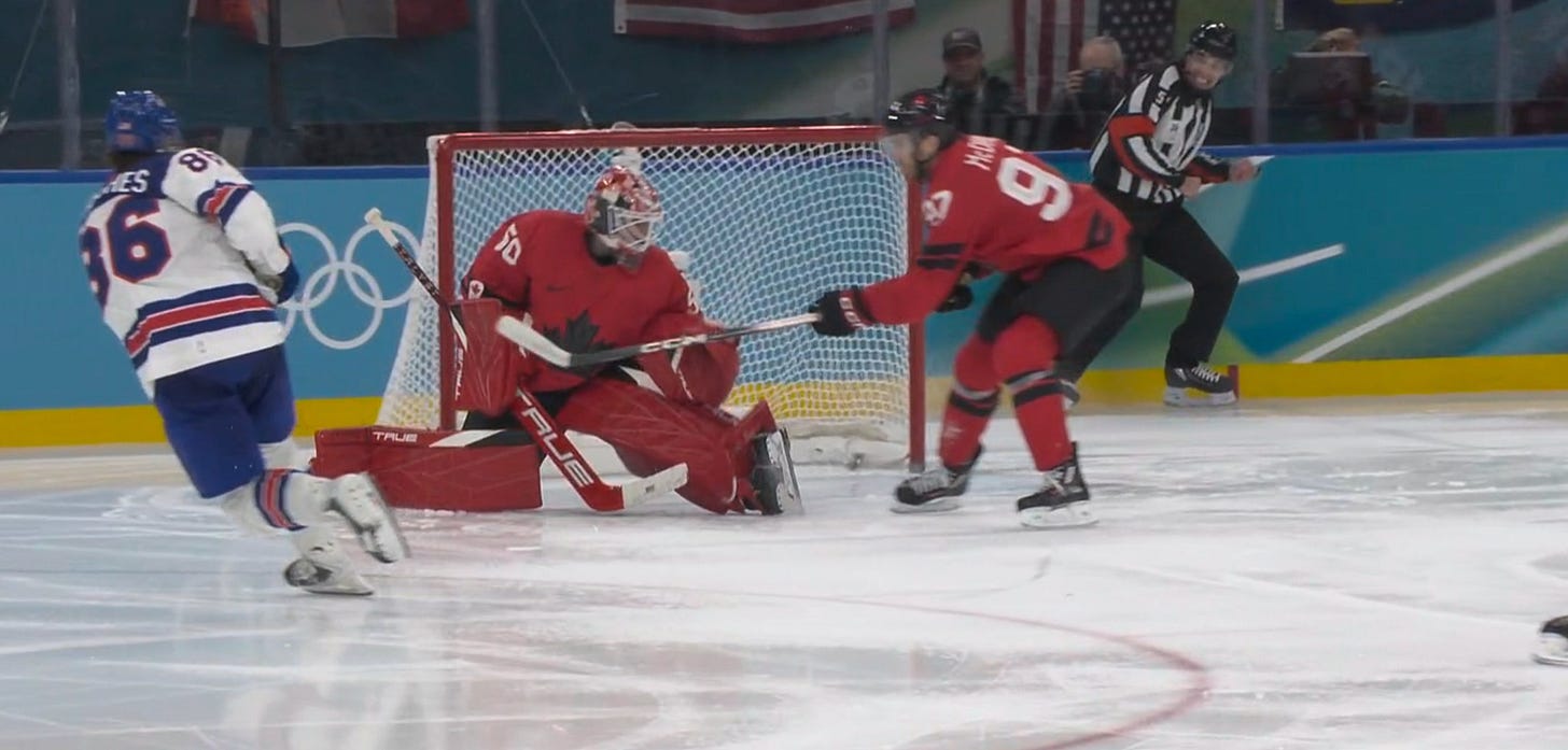 Canada finally would draw a power play, and then a second one 30 seconds after to give themselves a gilt-edged opportunity to turn the game around. But the thing about these opportunities is that they can really take the wind out of your sails if you squander them, and a couple of horrible decisions by Canada (Like MacKinnon one-timing a puck from the outfield, missing, and clearing it himself) along with nice goaltending and aggressive PK’ing from the USA (Brock Faber played all ~90 seconds of the 5-on-3) sent Canada back to the bench empty-handed on their biggest chance of the game.