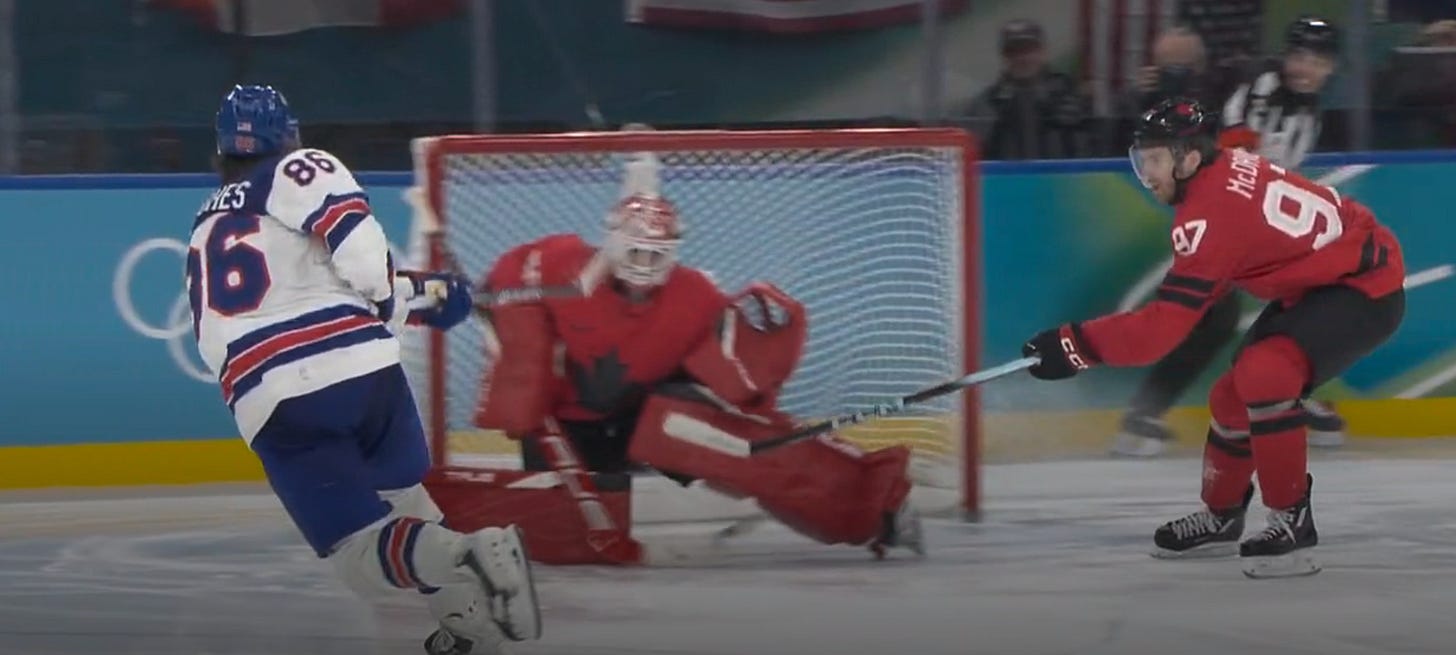 Jack Hughes could easily have been the goat of the game, in the classic sense. His penalty to take the US off the late power play could have been the dagger, as could his getting beaten by McDavid in overtime.