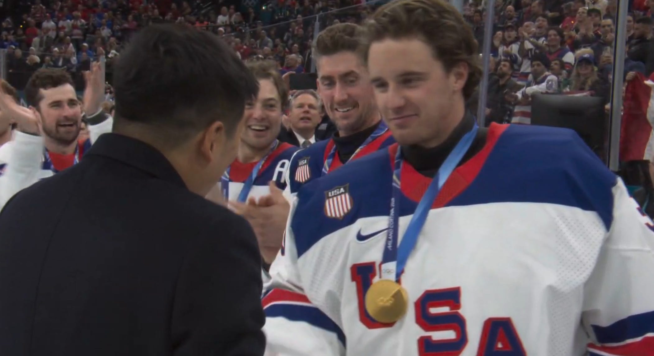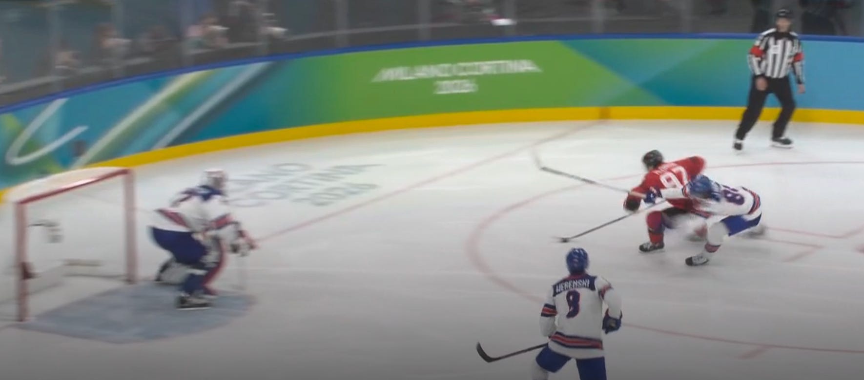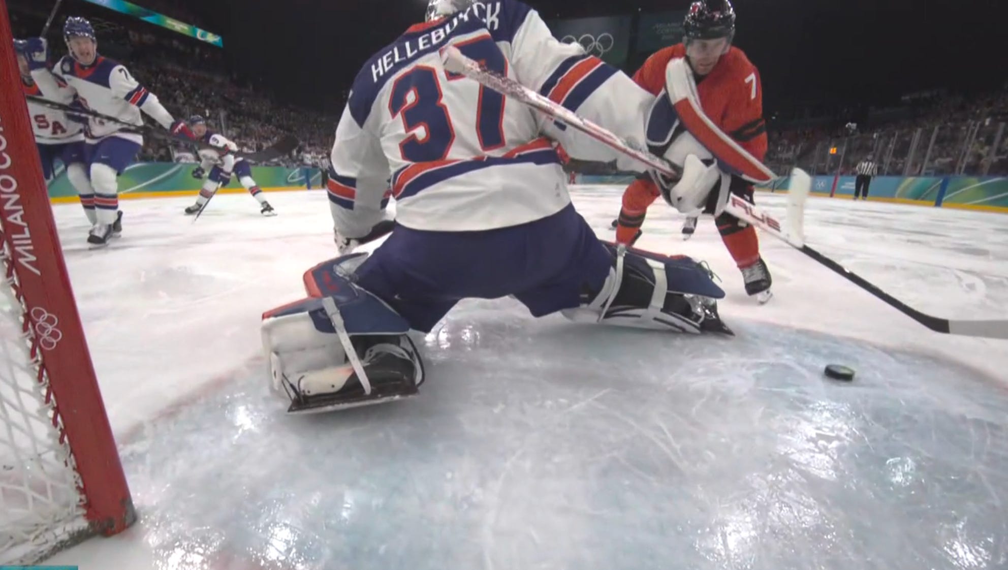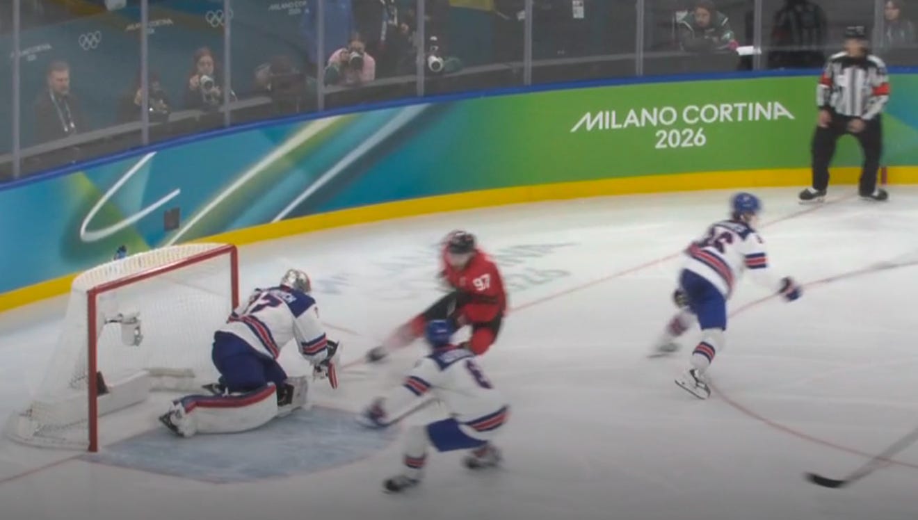 That meant 50 seconds of 4-on-4 with 3:23 remaining, and then a minute or so of Canada 5-on-4 power play in a 1-1 game. But impossibly, unbelievably, the USA survived chance after chance, as Celebrini missed the net on multiple slot one-timers with Hellebuyck at his mercy.