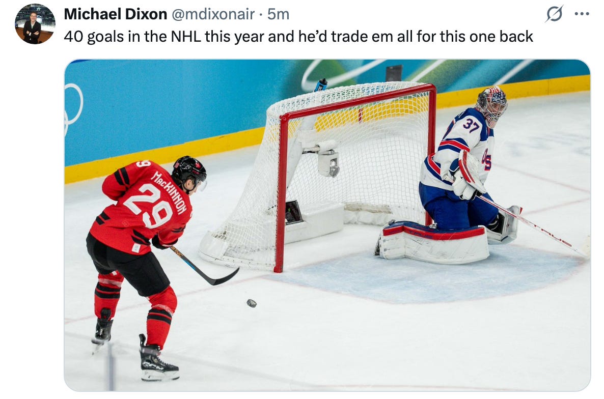 But that’s Sidney Crosby, because it always has been. Unlike Matthew Tkachuk at Four Nations, Crosby didn’t “gut it out” and choose to take up a roster spot in hopes he could find a big moment without the ability to play big minutes, even with a 13th forward available on expanded Olympic rosters. However close Crosby was—and he sounded probable in the 24 hours leading up to the game—Crosby ultimately decided that letting his team play for Gold with 13 healthier Canadian forwards was a better option than asking them to carry him with a flat tire.