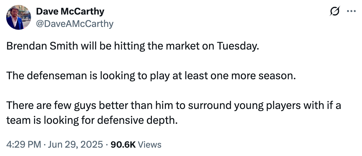 Here’s the most recent update on Brendan Smith, who is a free agent as of this writing: