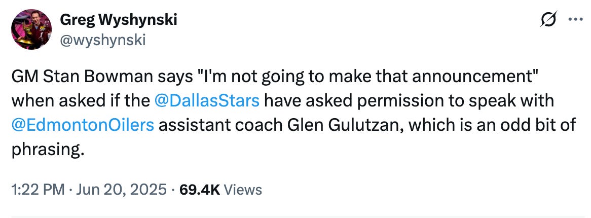 No, this isn’t explicit confirmation by the Oilers that the Stars spoke with Glen Gulutzan. But Bowman’s word choice here seems rather odd, as Wyshynski notes. There are plenty of ways to say “we don’t comment on coaching stuff for other teams” or something like that without using the word “announcement.”