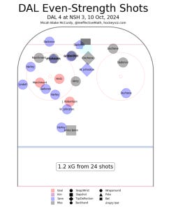 Yes, Nashville got the better of play, particularly in the second period after the Stars put up a lead and started sitting back a bit. But at even strength, it was far from a bloodbath, as the Stars actually did a fairly good job of keeping a lot of shots out of the critical areas, and the Predators did a good job missing the net on fully half of their best chances.