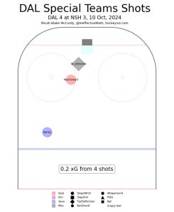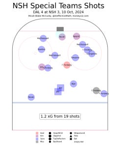 Now, for the less-fun part. Let’s take a look at the shot locations on special teams, where the Predators got six power plays to the Stars’ four: