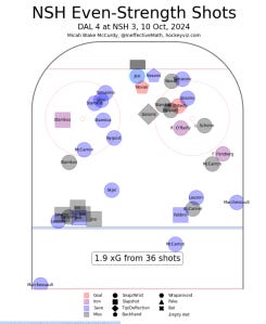 Nasvhille is one of the oldest teams in the NHL (3rd-oldest per Elite Prospects). And before Juuse Saros missed tonight’s game, they would’ve had something like a full complement of players, which older teams probably can’t bank on for most of the season. So for them to get 12 minutes of power plays and multiple Grade-A chances only to hit five posts and not even out-duel Dallas on the power play has to feel like a missed opportunity. I can’t imagine Dallas is going to be much more vulnerable than they were tonight, even if the even-strength battle really wasn’t all that lopsided.