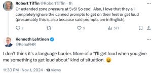 I also asked Heiskanen about that goal, and whether he was trying to front the shot (as Sean discussed the merits of in his mandatory 20/20) or just failed to get to Lundell’s stick, and Miro confirmed that he had tried to tie up Lundell’s stick, but that in that situation, you “need to be a little faster.” Ah well.