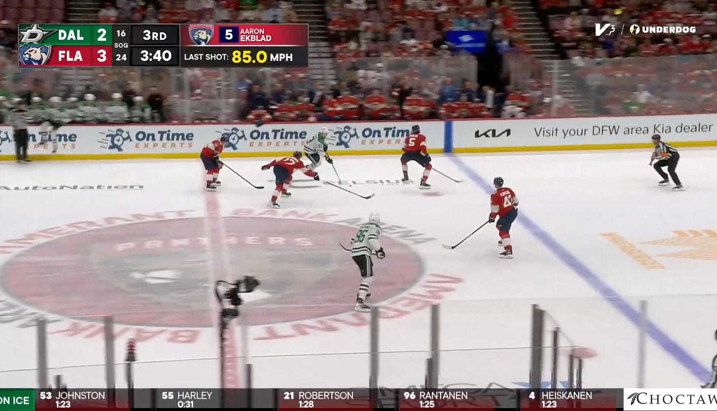 At first, it nearly went to 3-0 for the Cats after a blind Seguin backhand gave Florida a shorthanded rush the other way, with Jason Robertson basically just trying to occupy space while Aaron Ekblad came downhill and fired.