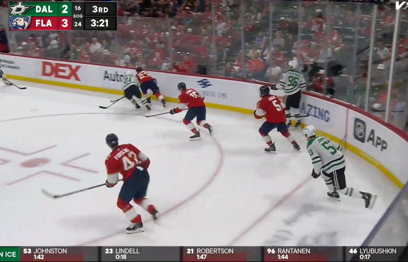 After weathering a big Florida push in the defensive zone, Wyatt Johnston and Rantanen went the other way at long last, and neither of them did the easy thing, dumping it in and going for a change, despite being 90 seconds into their shift.