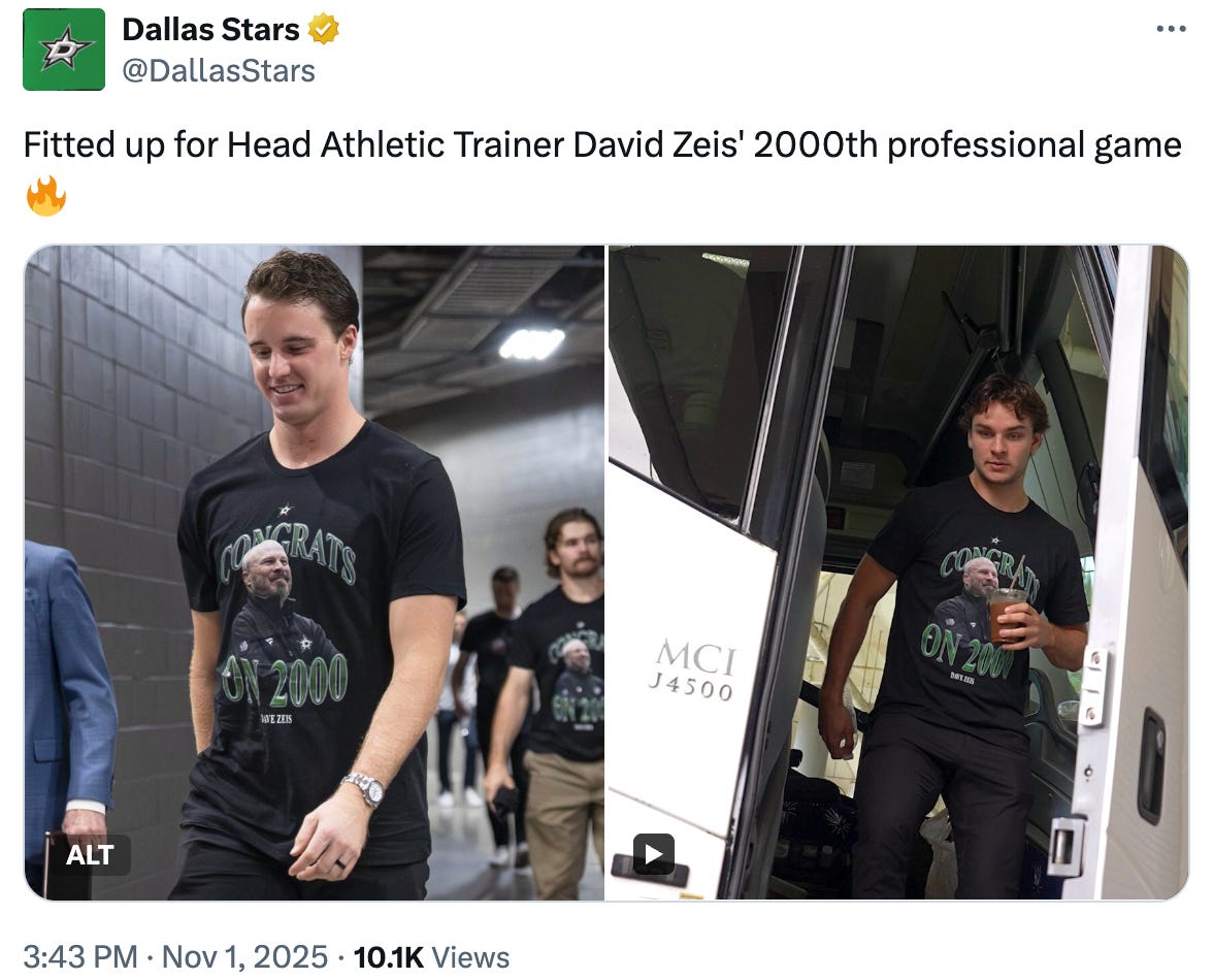 Dave Zeis worked his 2,000th professional game tonight. Zeis joined the Stars back in 2007, and he’s been a mainstay of the Stars’ athletic training staff ever since, and he’s seen some things. It was very cool to see him deservedly honored by the team he’s been with for going on 18 seasons now.