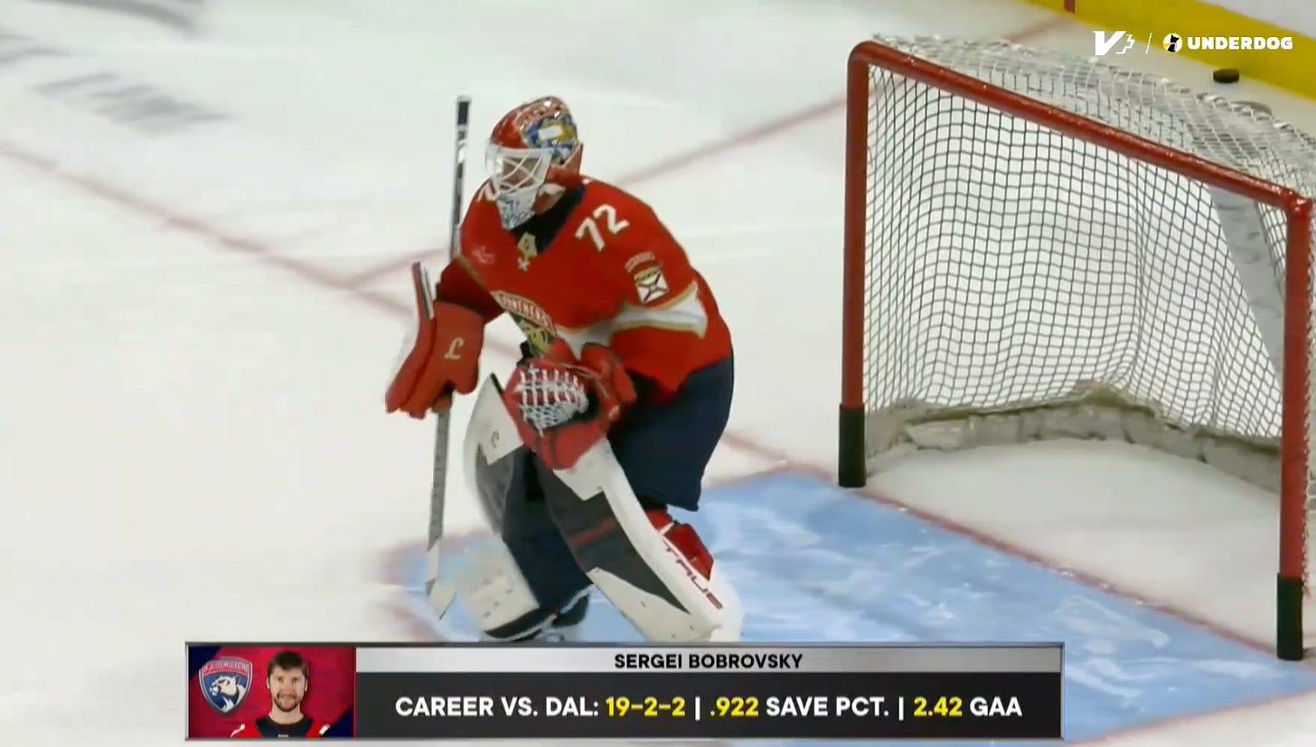 Johnston would eventually come off the ice for Sam Steel, but Rantanen and Robertson remained out there. Esa Lindell and Ilya Lyubushkin read the room, and they were activating hard, keeping the things going, maintaining possession along the walls. And after Robertson retrieved another puck and sent it back to Steel (who was covering for a pinching Lyubushkin), it would all end with Rantanen tipping a Steel pass over Bobrovsky in what I like to call “pulling a Hryckowian.”