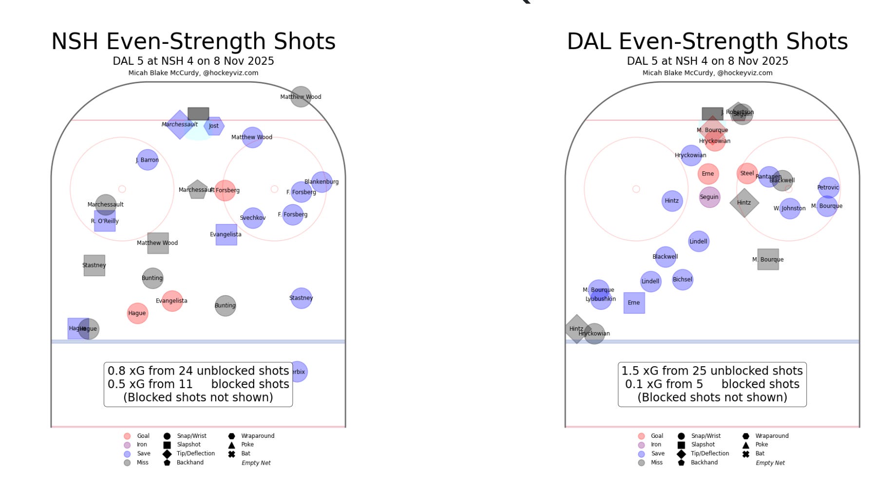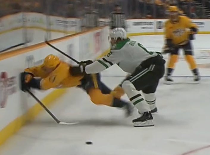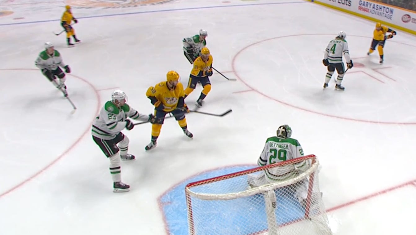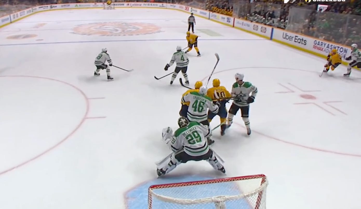 The hard Nashville forecheck really started giving Dallas problems in the second period, and I’m wondering if that’s a bit of the book on Dallas right now—counter their more deliberate breakouts with harder forechecking pressure along the walls, the way Florida was doing. And in fairness, that sort of pressure when executed well has a pretty demoralizing effect on the other team.