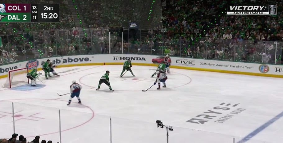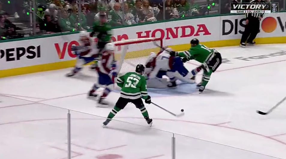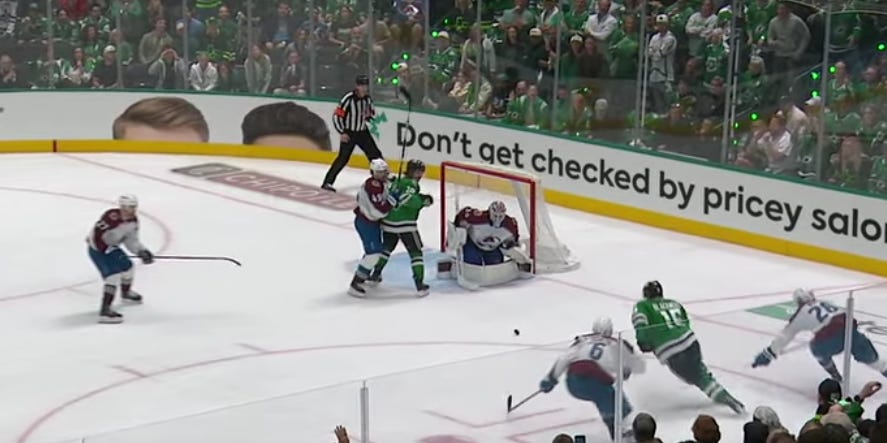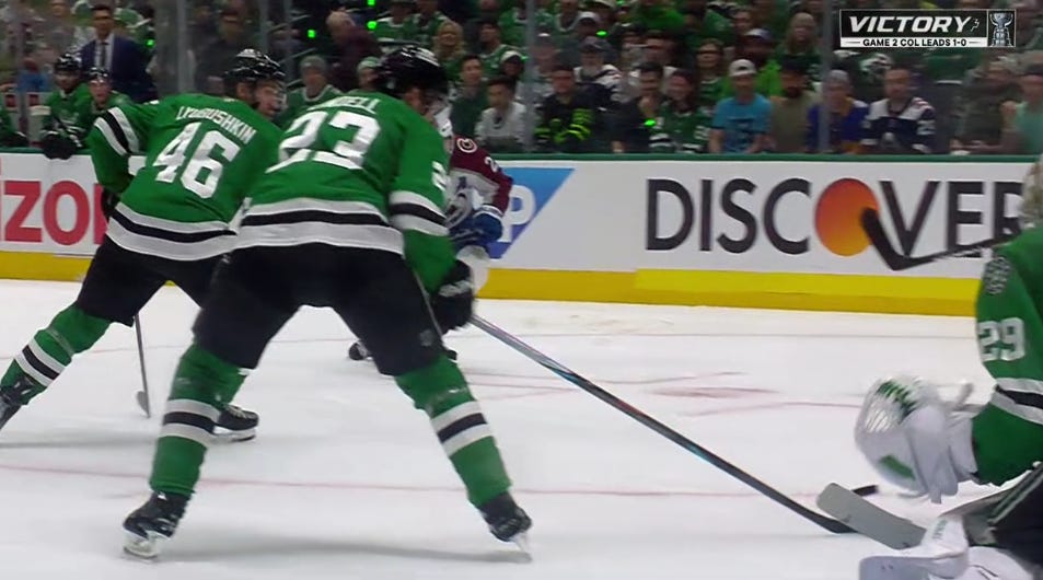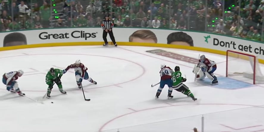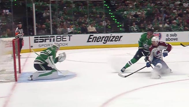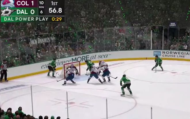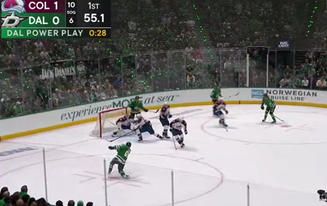 The nice thing about that was that Dallas had a guaranteed whistle before the end of the power play, and they would get to it, thanks to a crucial Oettinger glove save on Nečas from the dot, and some aggressive penalty-killing that prevented prolonged puck movement. Dallas made it to overtime, but with another 34 seconds of power play time to kill—and with Colorado having 15 minutes to draw up exactly the play to take advantage of it.