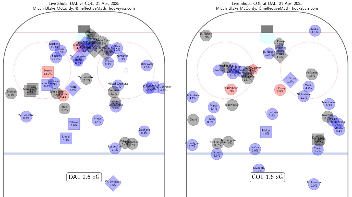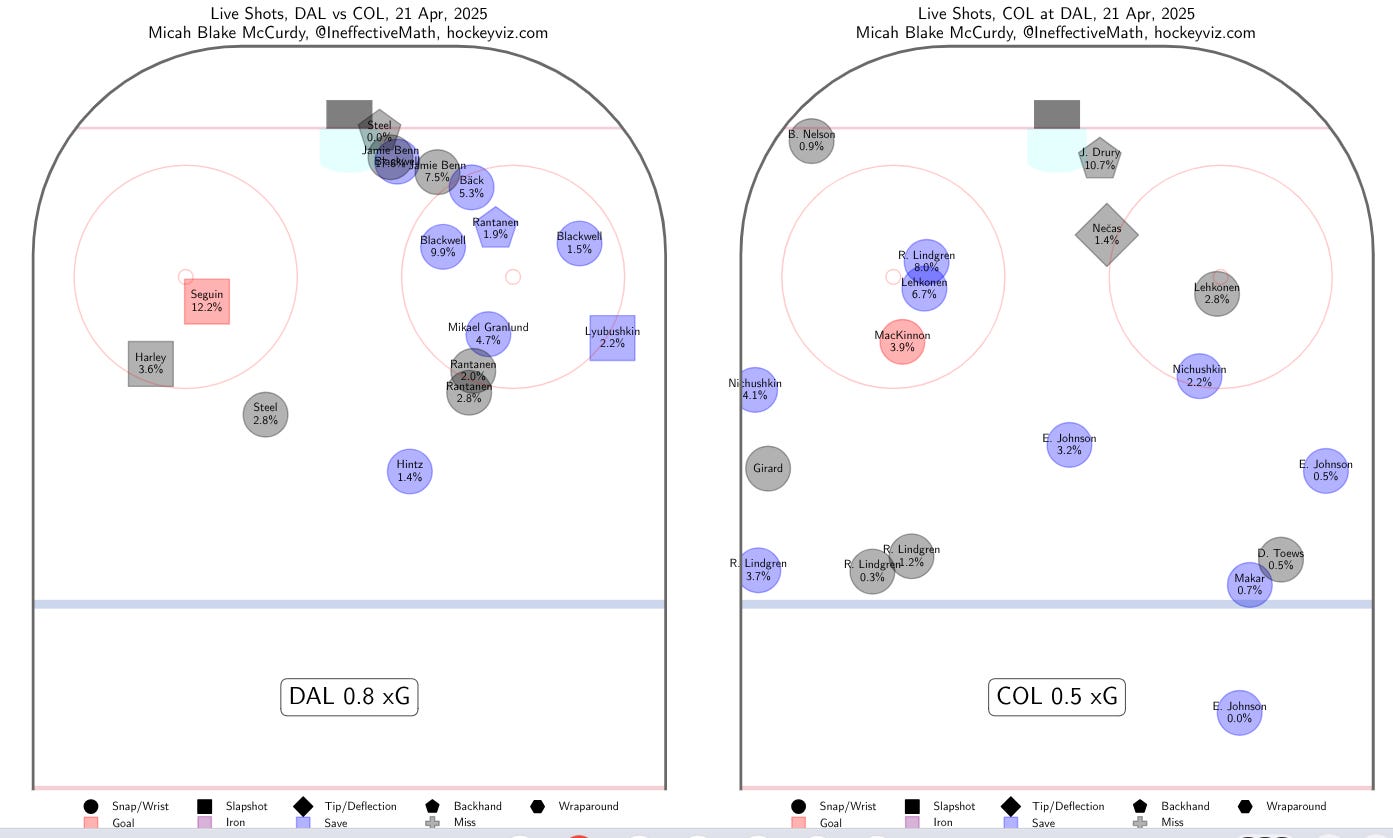 The Stars had maybe three shot attempts from above the circles, whereas the Avs had ten. There’s just more willingness to fire from distance with Colorado.