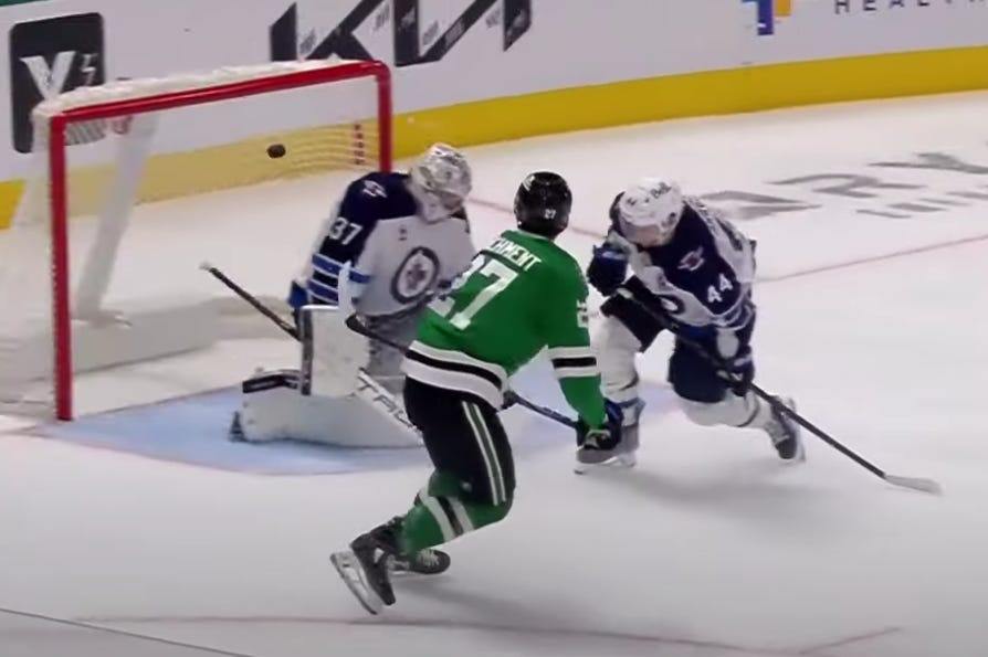 The Stars nearly evened it up when this rebound from Rantanen made it to Johnston, but because time is endlessly cruel, its waves caused a bump in the ice, and the puck jumped over the stick of Johnston: