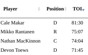 Sam Steel drove the net hard on Seguin’s goal, and he was a Georgiev goalstick shaft away from tying Nathan MacKinnon in goals this series. That’s how relatively absent the Avs’ best players have been from the scoresheet so far. Some of that is great defending by Dallas, not least of which is the third period clinic they put on, absolutely forcing Colorado to cough up the puck at the blue line countless times during the 2-1 portion of the game. But some of the Avs’ struggles might just be due to the fact that they’re asking their top guys to play minutes equivalent to the entire Top 4 defensemen in Dallas: