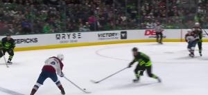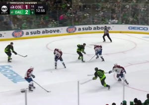 The Colorado comeback attempt started when Artturi Lehkonen scored off the rush, after both a pass and then a shot ticked off Dallas Stars sticks. Here’s the shot Lehkonen ended up taking, where the puck deflected off Lyubushkin’s stick and into Oettinger’s five-hole: