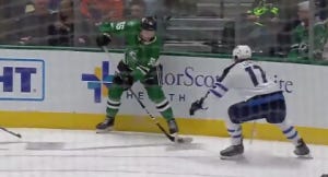 That ended when Mason Marchment spent an extra moment to harass Nino Niederreiter in the neutral zone, after which Marchment waited for Harley to find him after curling out from behind the Stars net, and that is what happened. Marchment was caught by Josh Morrissey, but he then used his frame to shield the puck and turn his back to the net, after which he sent a blind backhand high past Hellebuck’s glove hand and into the net.
