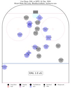 The Stars’ fifth chance of the day wouldn’t look much better, with an aggressive Winnipeg kill preventing Dallas from even testing Hellebuyck at all. Here’s what the Stars’ shots looked like on their five power play opportunities in the first two periods: