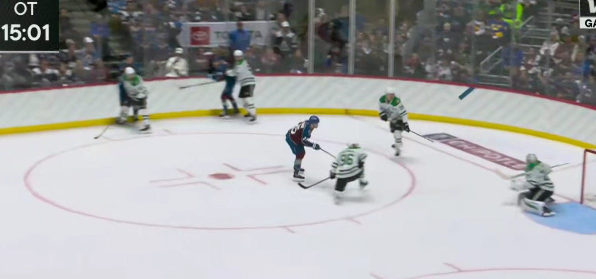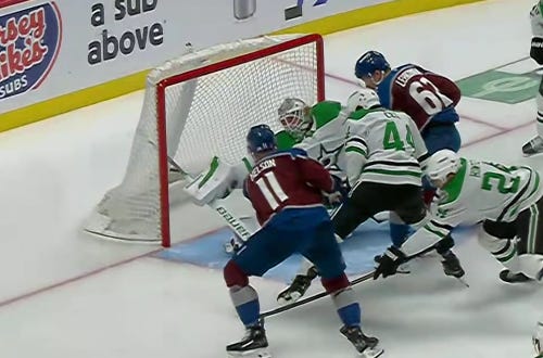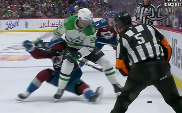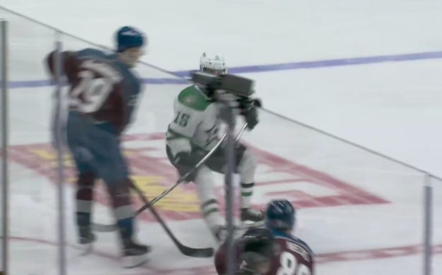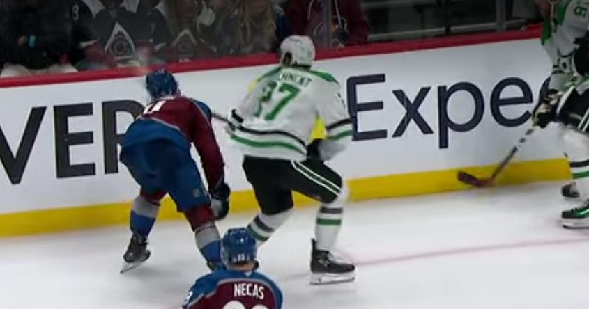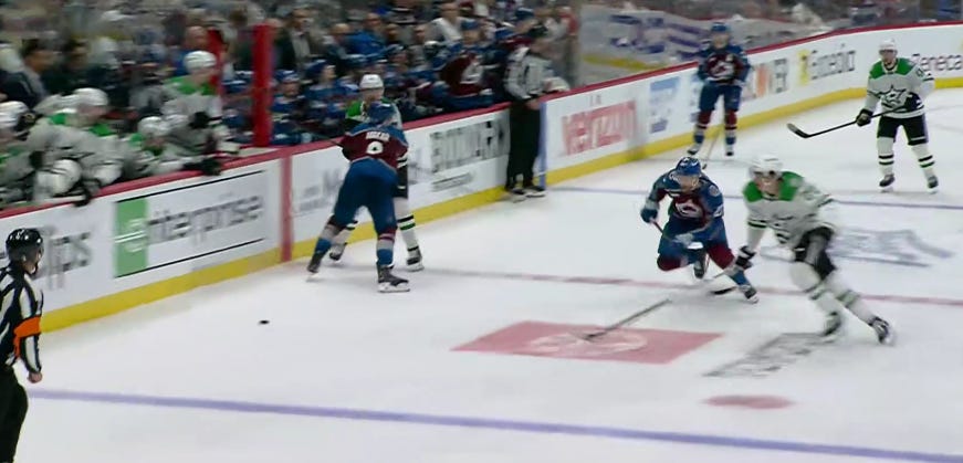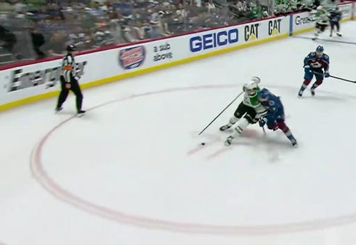The penalty calls in the first period started to aggravate the Dallas bench, and when Colin Blackwell got a stick into MacKinnon’s skates to bring him down (with the puck sitting between Mackinnon’s skates after he fumbled it and collided with his teammate).