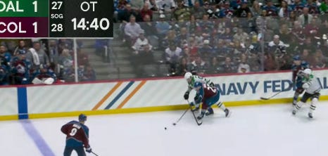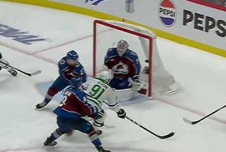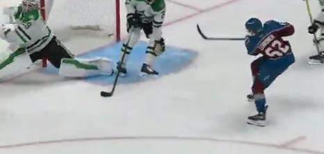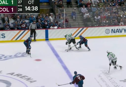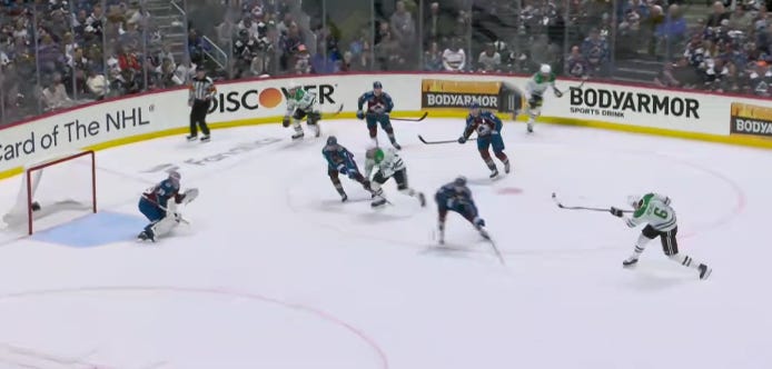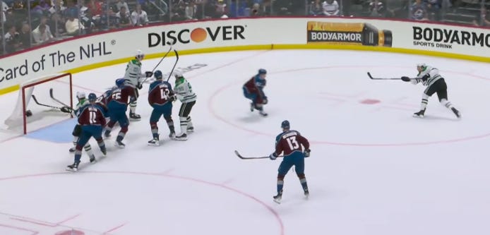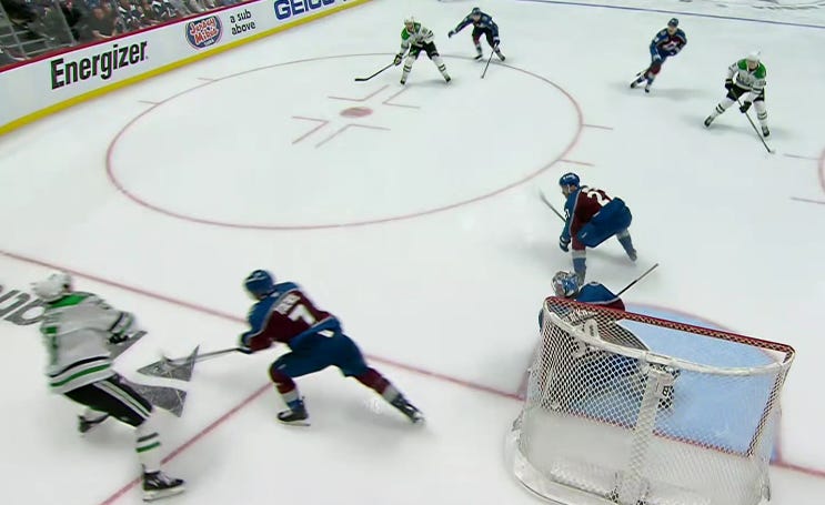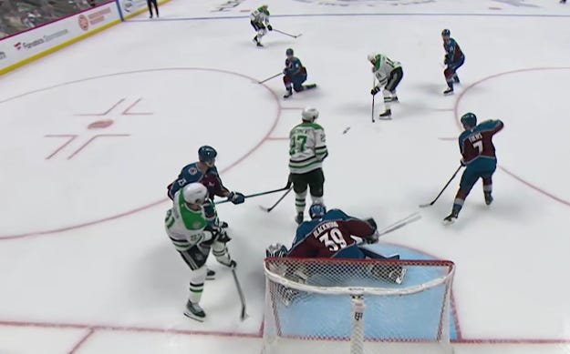 Things got dicey six minutes in, when the third defense pairing got trapped in the zone for two minutes, but a Cale Makar shot deflected just wide, and Dallas eventually cleared. In fact, not long after that, the Stars would get a power play, for what felt like the first time in the game, given the abbreviated nature of their original chance.