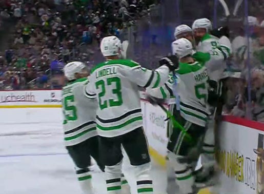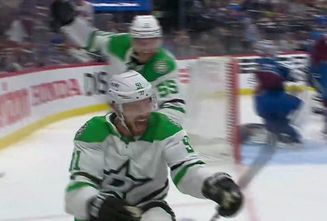 Jamie Benn and Tyler Seguin each scored goals in a 2-1 overtime playoff win over Colorado in Colorado in 2025. You wanna talk about gratuitous? It’s that.