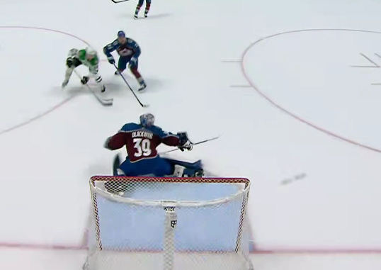 The Stars got another chance themselves on a neutral zone turnover by MacKinnon to Rantanen, but the puck didn’t cooperate the moment of truth, and Rantanen’s rush in on Blackwood turned into a dribbling shot that was easily covered.