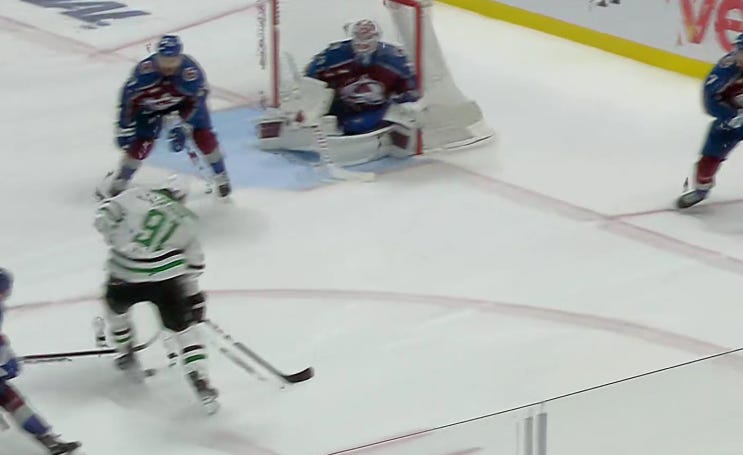 And he sees Tyler Seguin, his good buddy and linemate, coming downhill, having come off the bench for Rantanen, and beating Cale Makar to the scoring area. Drouin has recovered and is blocking a pass to Thomas Harley(!), who has sense the importance of this chance, and is at the back post to draw Drouin away from Seguin’s shooting lane.