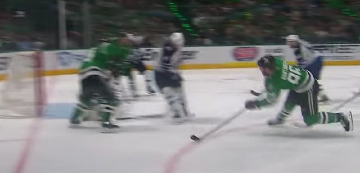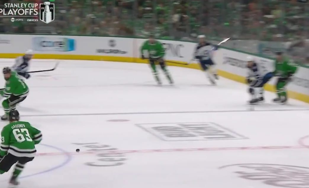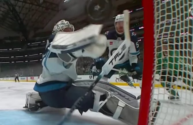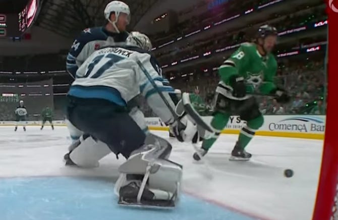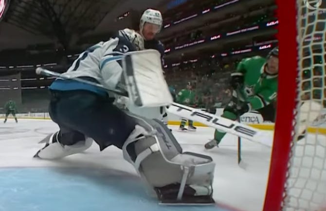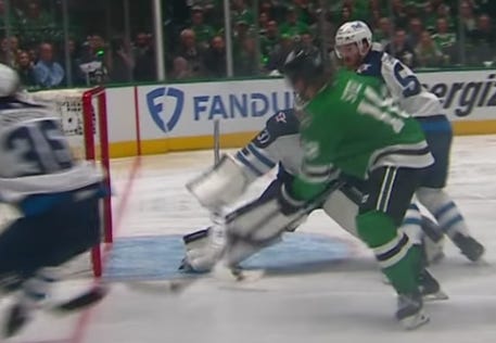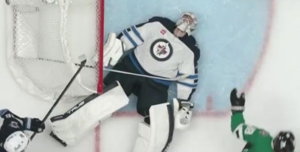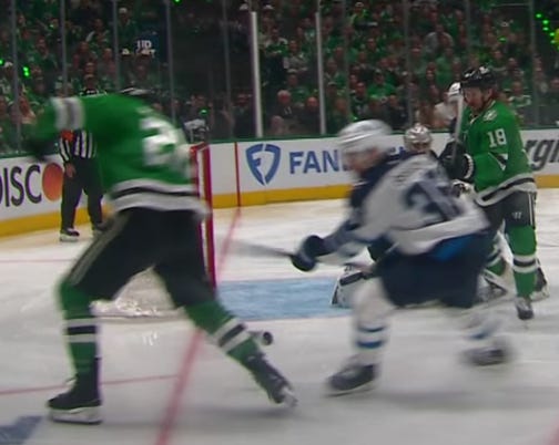 By the way, here’s what happened: the puck basically shorthops on Hellebuyck, so when he swipes his stick at it, the puck bounces of the angled stickblade and spins up and off of it, fluttering perfectly into the net in another bout of karmic retribution for the weird bounces Dallas suffered in Game 2.