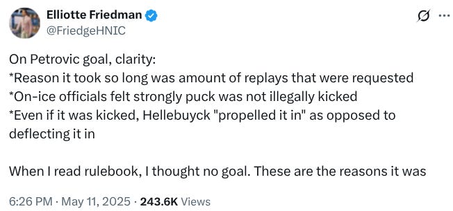 And in this particular playoff hockey game, you probably found yourself suddenly having extremely strong opinions about the wording of NHL Rules about kicking, deflections, sticks, and propelling (or the lack thereof). You also found yourself feeling either aggrieved or embarrassed on Mason Marchment’s behalf, or perhaps both at the same time.