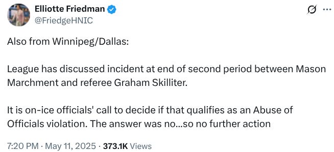 Still, the league discussed Marchment’s actions, and every single official in the NHL and AHL is going to be talking about this tomorrow. Marchment may have “gotten away with it,” but he can’t control his temper after the next no-call he has to deal with, I wouldn’t be on him getting anything close to this much leash in the future.