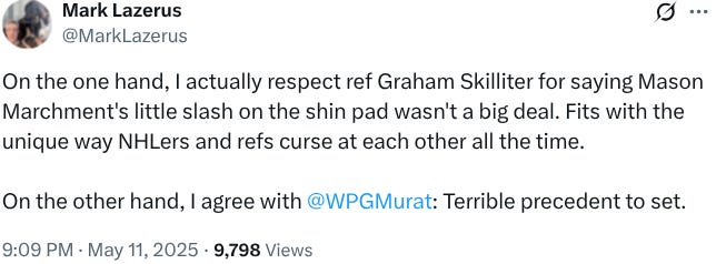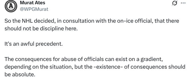 First, let’s not skip over the fact that we are actually getting a version of what we’ve all been asking for: the reasoning of the on-ice officials. Friedman is hardly a pool reporter going in to talk to Graham Skilliter after the game, but he is at least, probably via the NHL Situation Room in Toronto, relaying what some of the conversations between the referees and Toronto were about.