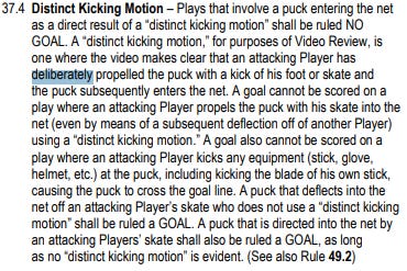 First, they could have ruled the puck hadn’t been kicked in an intentional manner, like the officials did with the Artturi Lehkonen volley from last round. Intent, remember, is key to the rule, as you can note from the word “deliberately” here.