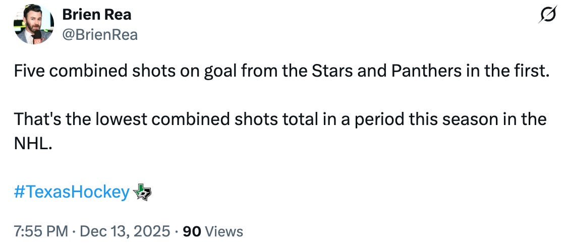 But a Florida icing led to Some Real Action, including a Duchene shot from the front porch that Bobrovsky’s glove and shoulder kept under control. It all ended in a hooking penalty on Mackie Samoskevich, but the Stars’ power play couldn’t generate a single shot on goal against an aggressive Florida penalty kill, and that was that. The first period ended with a 0-0 score, and shots on goal at 3-2 for Florida.