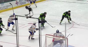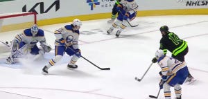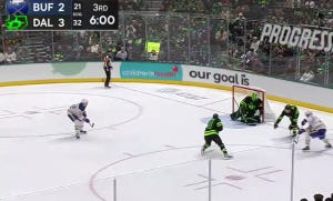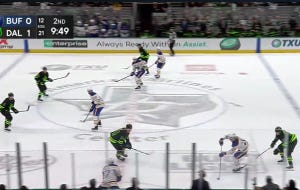 The Buffalo penalty kill is giving Dallas a lot of space, and Johnston just walked in and got a great chance in tight, but no joy. Roope Hintz just hit a post on a quick skate-to-stick play, but posts are not worth as many goals as nets, I am told. Anywhere, here is a screencap of the shot, which was created by a very basic tic-tac-toe pass from Heiskanen to Johnston to Hintz, and then in the second screen cap where you can see Hintz starting into the rafters as the puck bounces away.