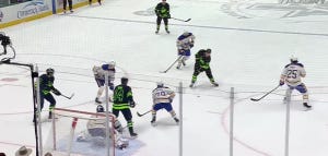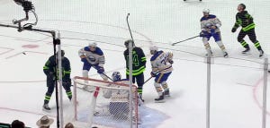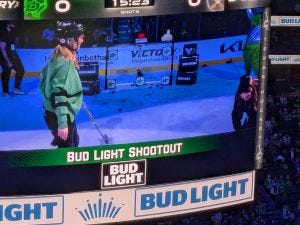 The power play has found a very exciting way to go 0-for-1, and isn’t entertainment the point, really? It is now the first intermission, and a brother and sister are competing in the Bud Light Fill the Cooler Shootout.