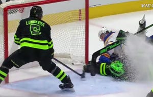 3-2, Dallas. The crowd didn’t realize it for a moment, but Wyatt Johnston sends a Pavelskian tip over Luukkonen’s shoulder off a pinch by Harley that works much better than his earlier one, as he sends a hot pass to Johnston in the slot, and the puck is tipped home with the hockey equivalent of Gregg Turkington’s film expertise.