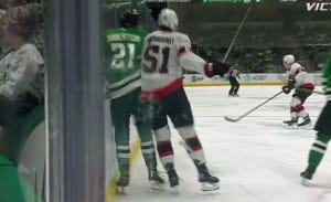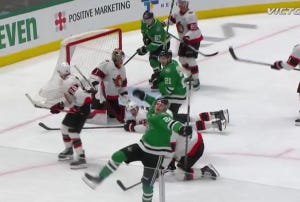 First, Harley tried an overly cute pass off the faceoff back to Duchene in the circle, and turned it over to Shane Pinto, who faked a shot to freeze the Stars before slapping it over to Tkachuk for a slam-dunk on the back door. And before that goal had even set in, Heiskanen would get the puck taken away behind the net by Tkachuk, who fed Ridly Greig for a low-to-not-quite-as-low chance that Oettinger could only gamely try to get a piece of as it went in on his blocker side.