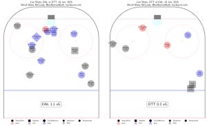 Thomas Harley had a second loose puck play in his own zone in the final bit of the first period that mercifully didn’t turn into anything worse, but this time he almost made up for it with a beautiful fake-shot/slap-pass to Duchene in the far circle, but the Stars’ leading scorer took just a tick too long to gather the pass before shooting, and Meriläinen was able to shrug it away after getting across to take the Sens’ lead into the first intermission. It was a frustrating deficit for Dallas, who squandered a power play goal by serving up two pizzas hot & ready, as this shot chart from the first period demonstrates:
